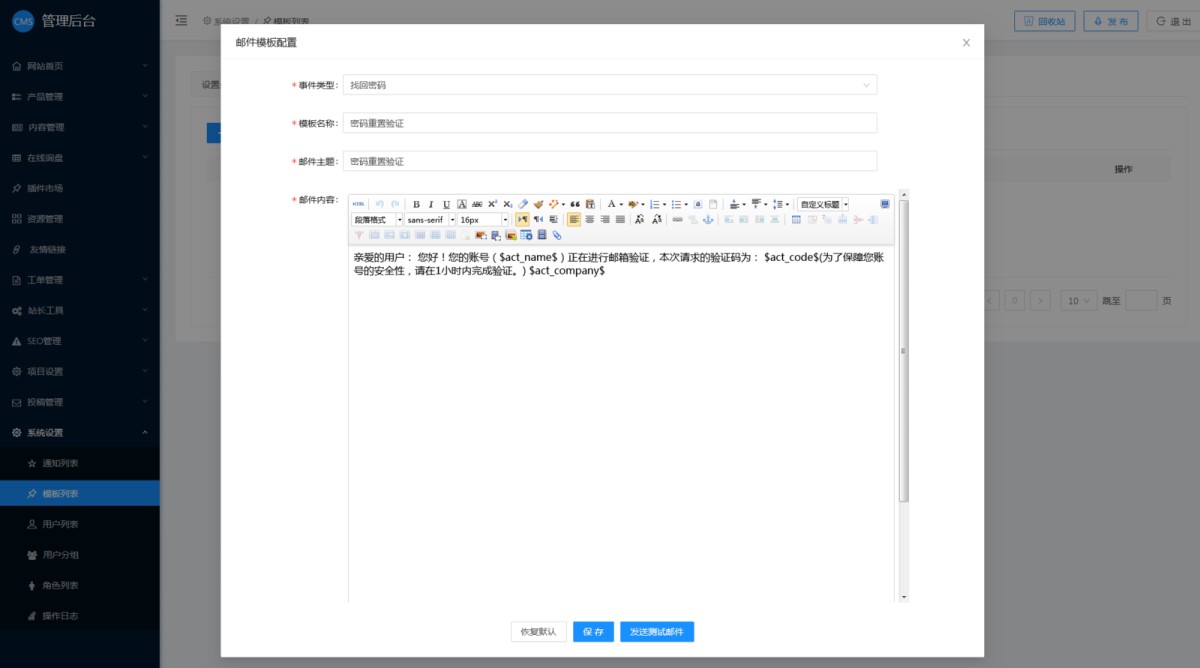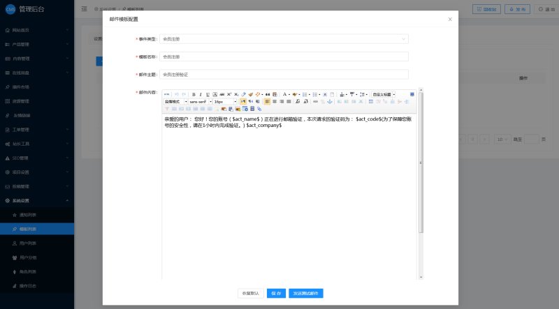7,事件类型是下拉选项的,有会员注册和找回密码两个类型,依次添加设置即可。模板名称和邮件主题可自定义。邮件内容,系统会提供默认模板,可以自行调整,但是模板中的变量不可以修改。