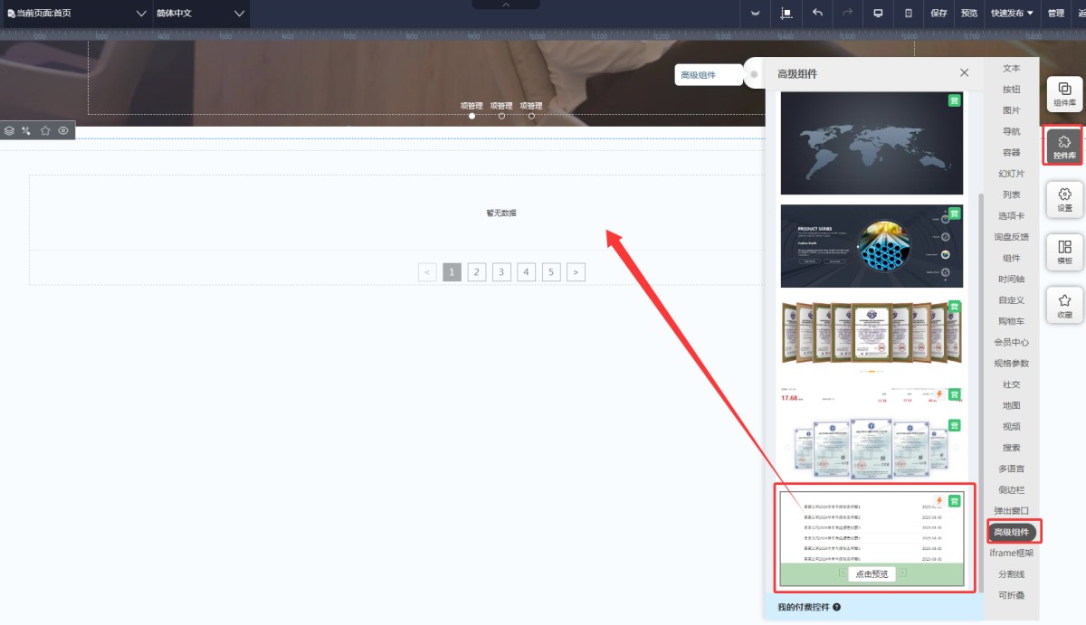 1,进入网站的UI设计界面,在控件库-高级组件里,拖入沪市公告组件,添加到页面上。