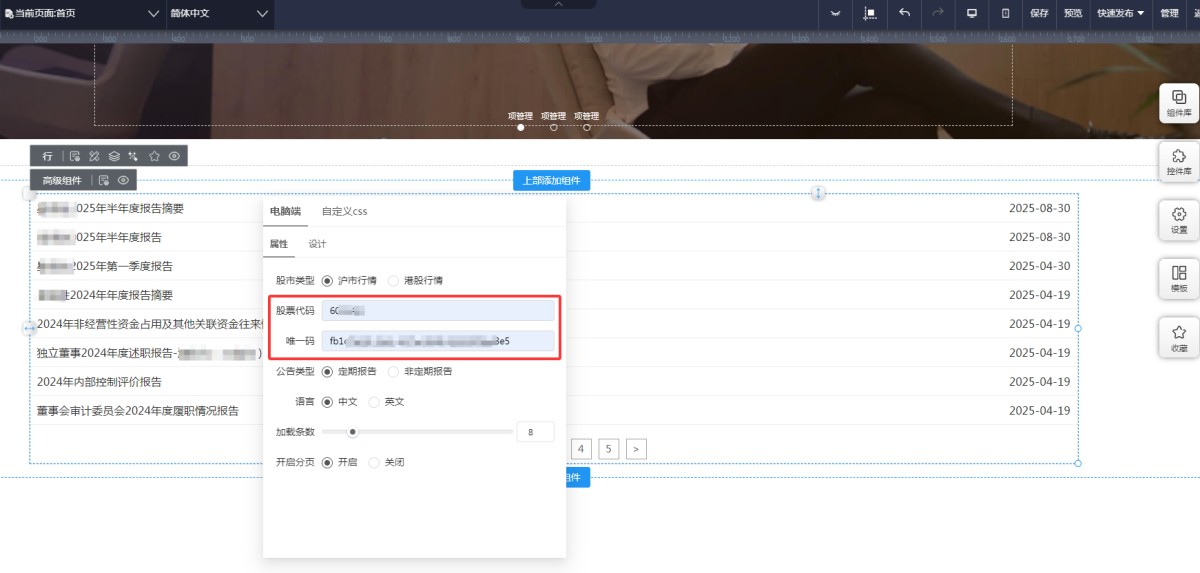二、网站UI设计页面添加沪市公告控件,并配置唯一码和股票代码