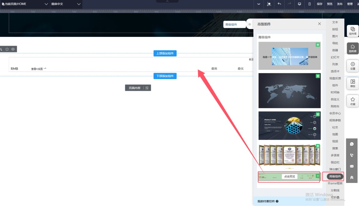 1,进入网站的UI设计界面,在控件库-高级组件里,拖入沪市行情组件,添加到页面上。