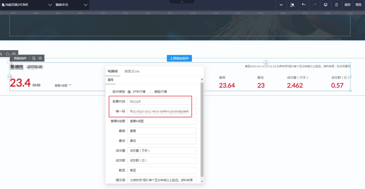 沪市行情对接的是上证e服务的接口,展示的是在上海证券交易所进行交易的股票和相关金融产品的市场动态和价格信息。通过调用相关数据,企业可以将自己的股票信息展示在网站上。该功能需要获取接口调用唯一码和股票代码。