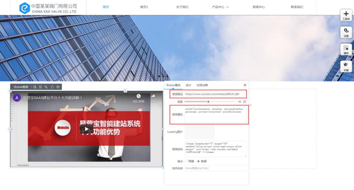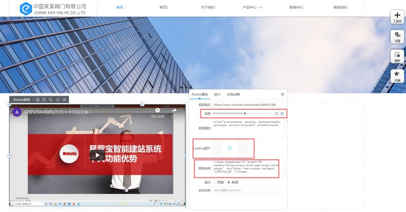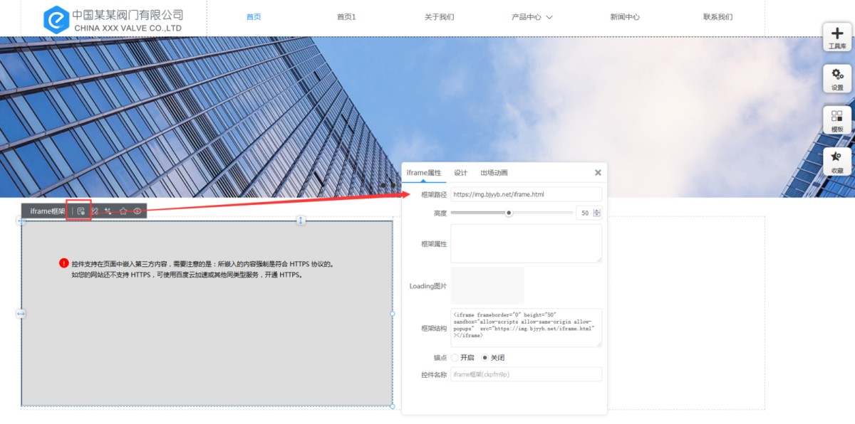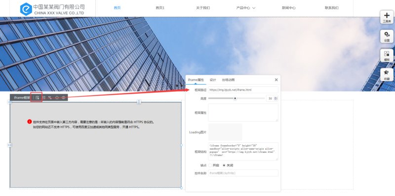 2,点开iframe框架控件属性,将从第三方获取的路径、属性等添加到对应的输入框里。