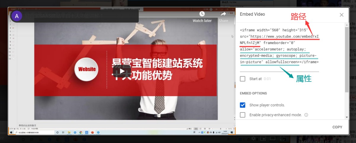 3,以下用Youtube视屏上获取的iframe代码举例。在Youtube视频下方的分享按钮里找到iframe代码。