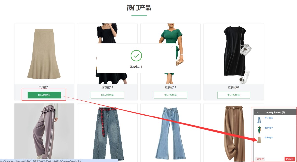 在列表上将产品添加到购物车时,页面上会提示添加成功,同时在右下角会显示一个购物车弹窗,里面会显示已经加到购物车的产品。