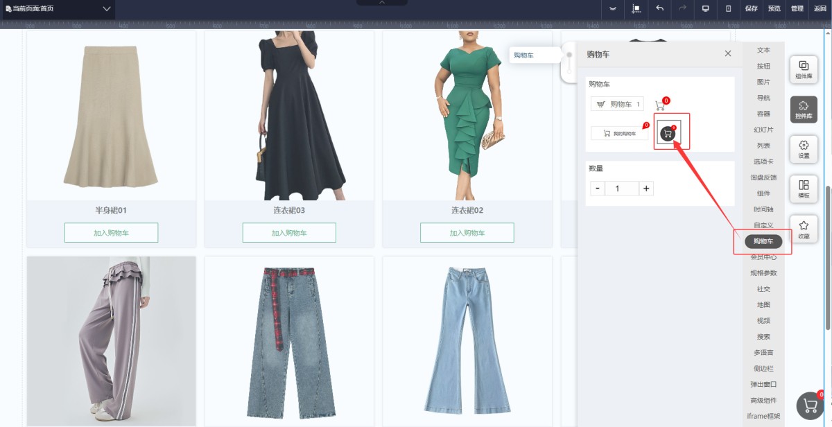 1,在控件库的购物车控件里,选择侧边浮动的购物车样式,添加到页面上。添加后,会浮动显示在屏幕的右侧下方位置。