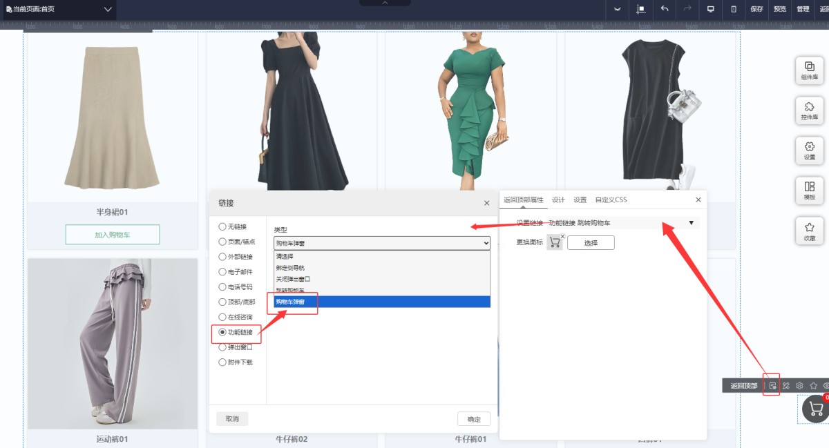 2,在购物车的属性,设置连接里,选择功能链接-购物车弹窗。点击确定即可。