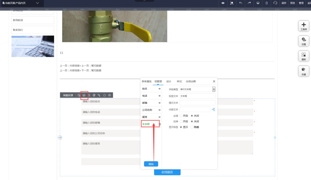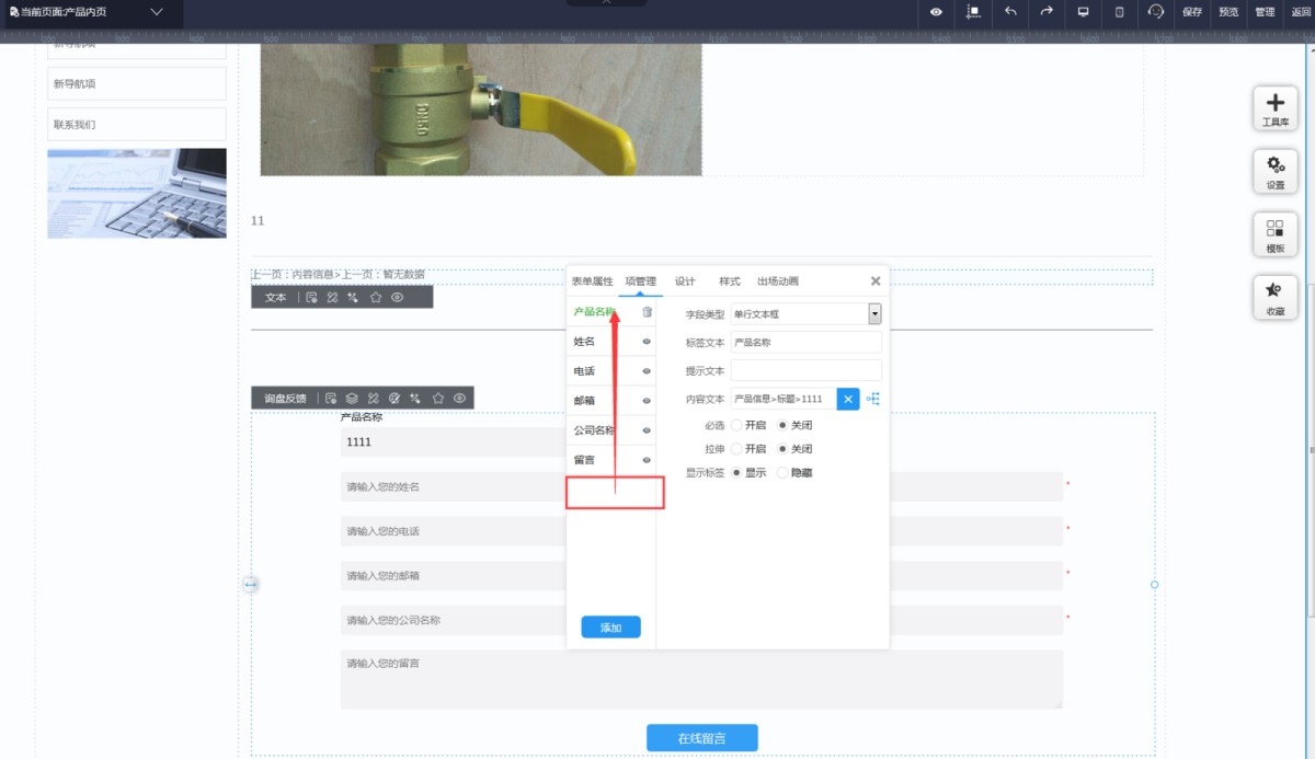 1,在产品内页,表单属性-项管理里,添加项。