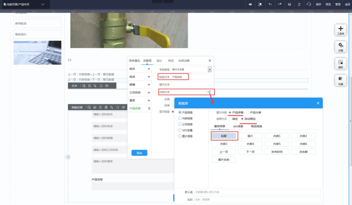 2,把标签文本改成“产品名称”,内容文本选数据源,选自动绑定标题。
