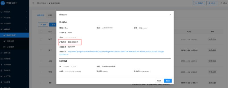5,访客提交询盘后,在后台表单反馈里会显示产品名称。