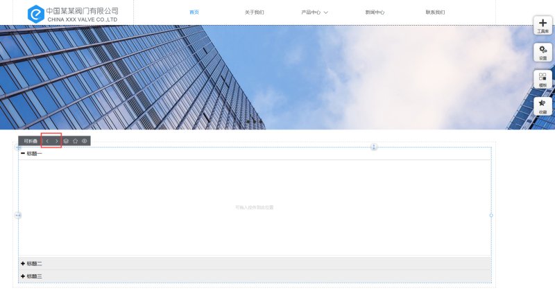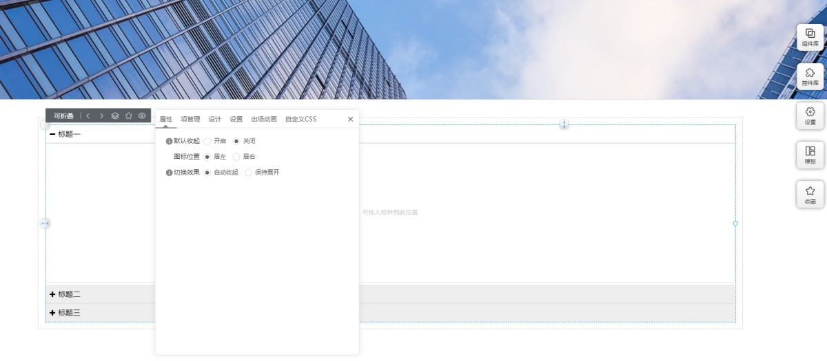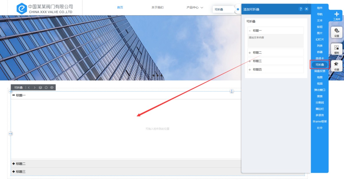 1,从工具库里选择可折叠控件,拖入到页面上。