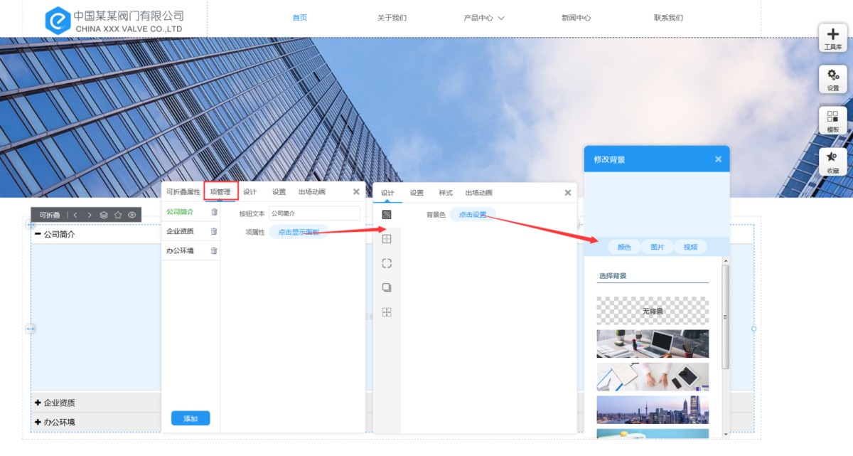 4,在“项管理”里,可以添加和删除标签项,可以拖拽调整标签项的排序,编辑标签按钮的文本。同时可以设置每一项里的背景色或背景图,以及边框、圆角、阴影和定位。
