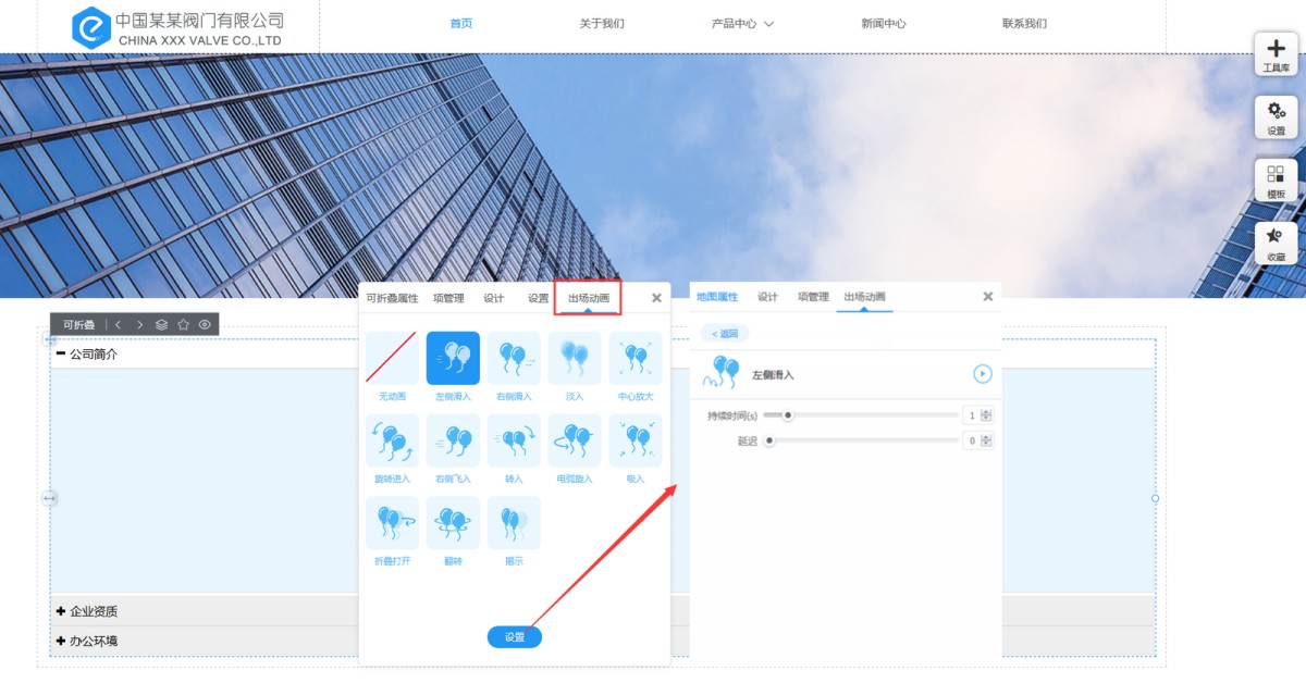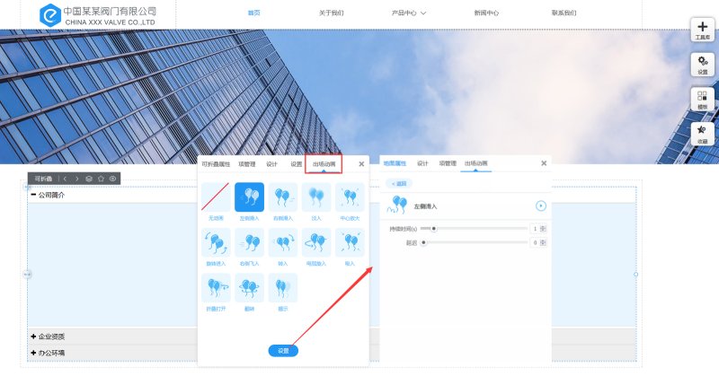 7,在“出场动画”里,我们提供12种动画效果,并且可以设置动画的持续时间和延迟时间。