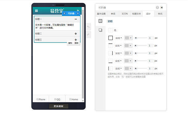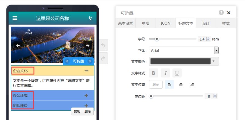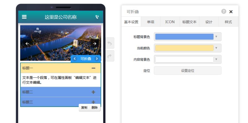 1,在页面编辑里拖入可折叠控件,在基本设置里,可以设置标题的默认背景色和选中背景色,设置内容区域的背景色等。