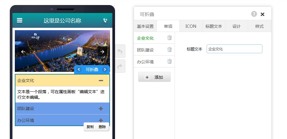 2,在“单项”里,可以设置标题的文本,也可以添加和删除折叠项。