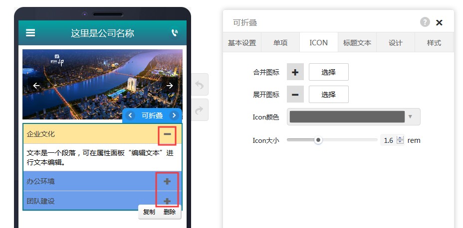 4,在ICON属性里,可以设置选择合并和展开的图标,以及Icon颜色、大小。