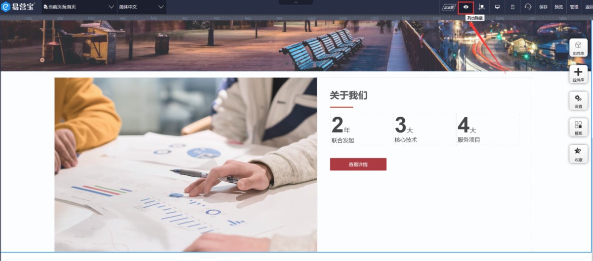 2,控件隐藏后,在页面上就不显示,如果想要把隐藏的控件显示出来,可以点击页面右上角的“列出隐藏”按钮。