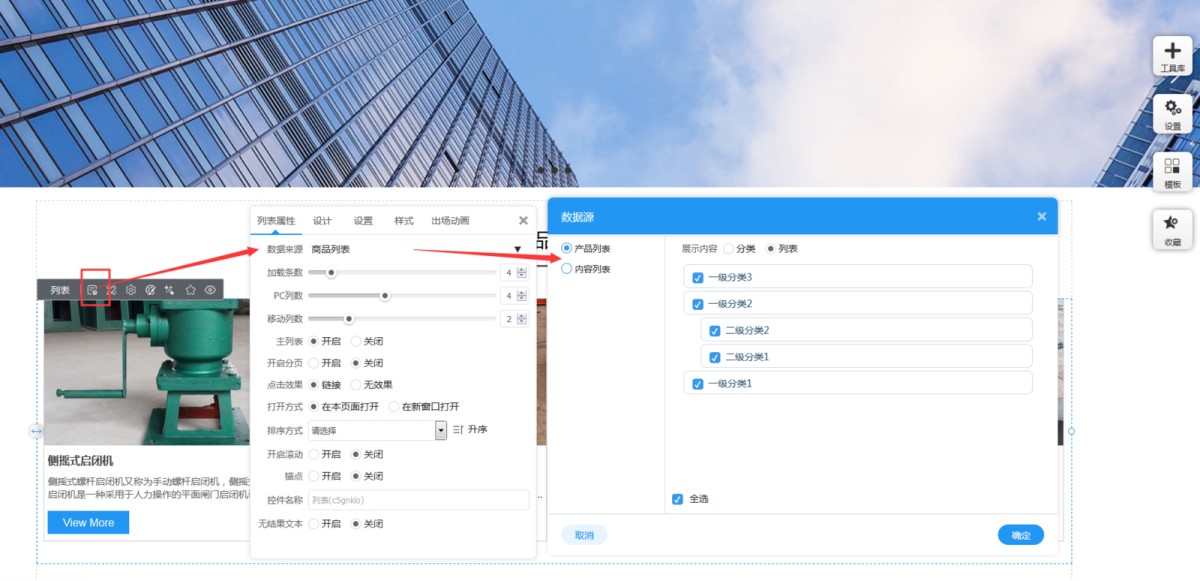 2,在列表属性里选择数据来源,包含调用后台的产品或内容。同时可以选择该列表是展示产品列表还是产品分类列表。