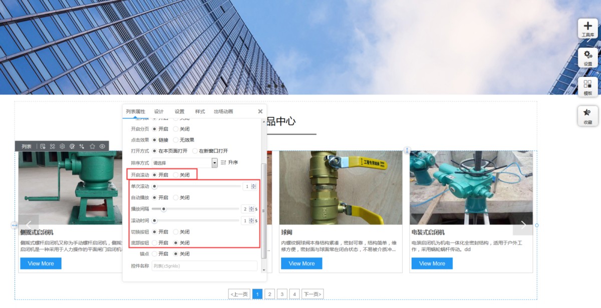 4,列表可以设置滚动。开启滚动后,可以设置但是滚动个数、是否自动播放、播放间隔、滚动时间等等。说明:开启滚动后,属性里最上面的加载个数是指一共有多少个产品在这里参与滚动,PC列数只是显示几个产品,单次滚动是指一次滚动几个产品。单次滚动 ≤ PC列数 ≤ 加载个数。