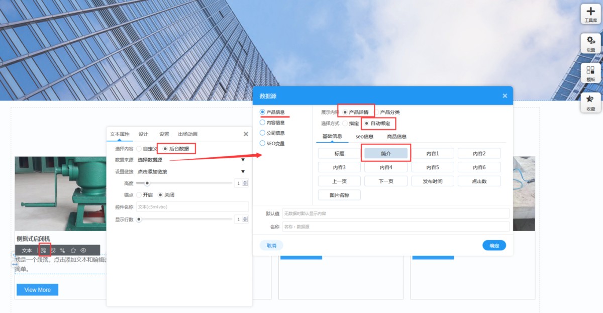 11,在文本属性里,选择后台数据-产品信息-产品详情-自动绑定-简介。注意:这里必须选自动绑定,如果选的是指定,那列表上的所有产品显示的简介就会是一样的了。