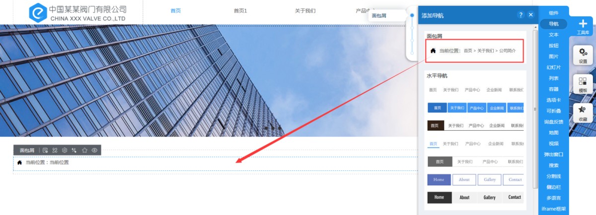 1,在工具库-导航控件里,选择面包屑导航,添加到页面上。