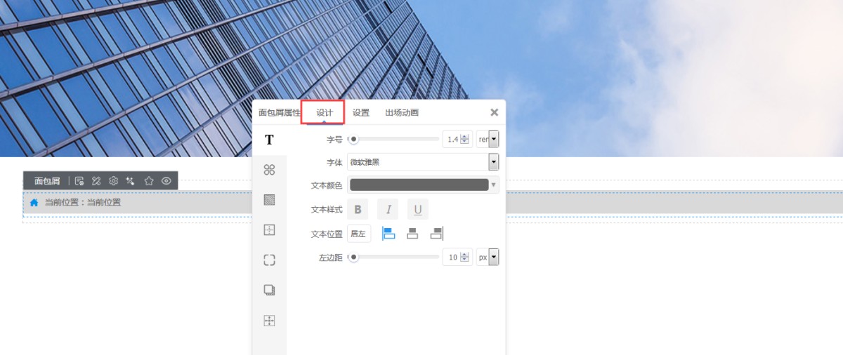 4,在“设计”里,可以修改文本样式、ICON大小和颜色、背景色、边框、圆角、阴影和定位。