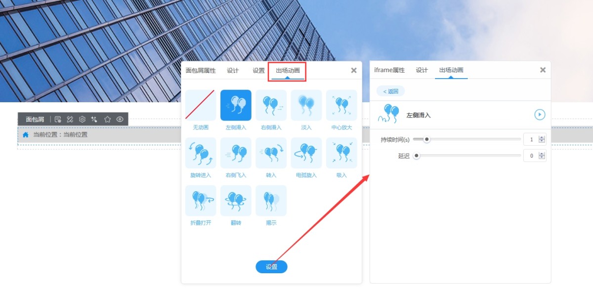 6,在出场动画里,可以为面包屑控件设置动画效果。我们提供12种动画效果,并且可以设置动画的持续时间和延迟时间。
