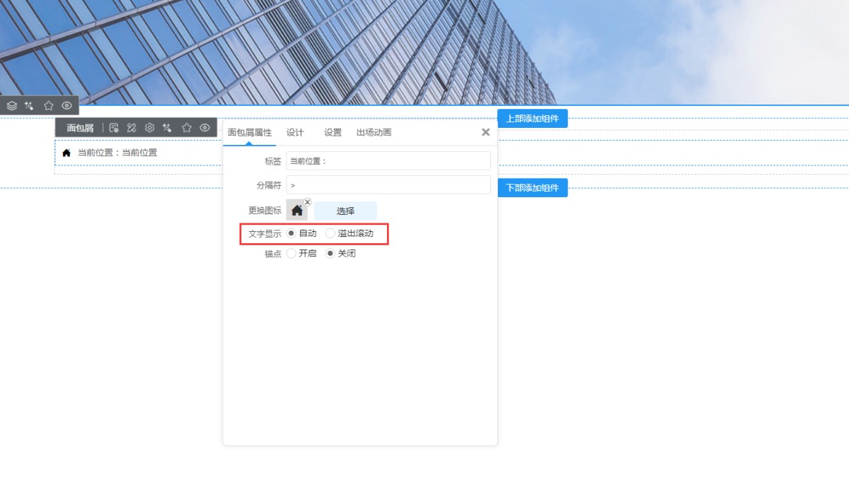 3,在面包屑导航属性里有个文本显示,指的是当面包屑上的路径文本长度超过屏幕宽度时,文本的显示效果,包含自动换行和溢出滚动两种。该功能主要体现在手机端,由于手机屏幕小,所以产品新闻详情页的面包屑导航在手机上一般都会超宽,可根据需求选择自动换行或滚动显示。
