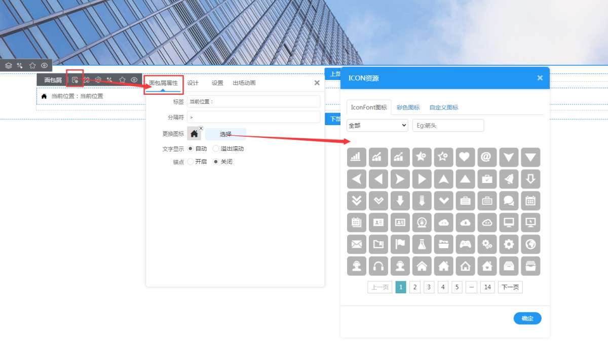 2,在面包屑属性里,可以修改标签文本、分隔符和图标等。