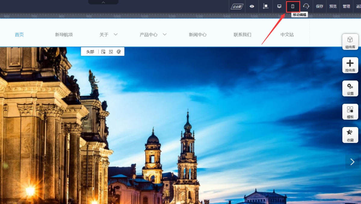 1,在响应式编辑页面点击右上角的手机图标,进入移动编辑页面。