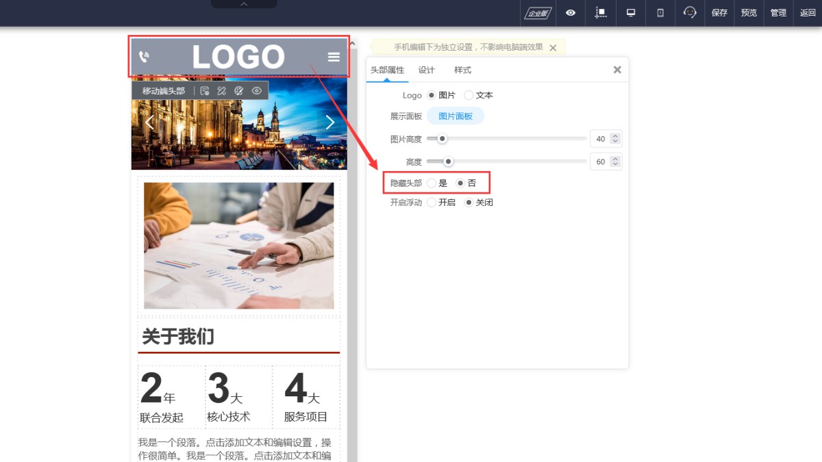2,点击移动端头部,在头部属性里,把隐藏头部这里选否,这样头部就会显示出来(说明:每个页面要单独设置取消隐藏头部)。