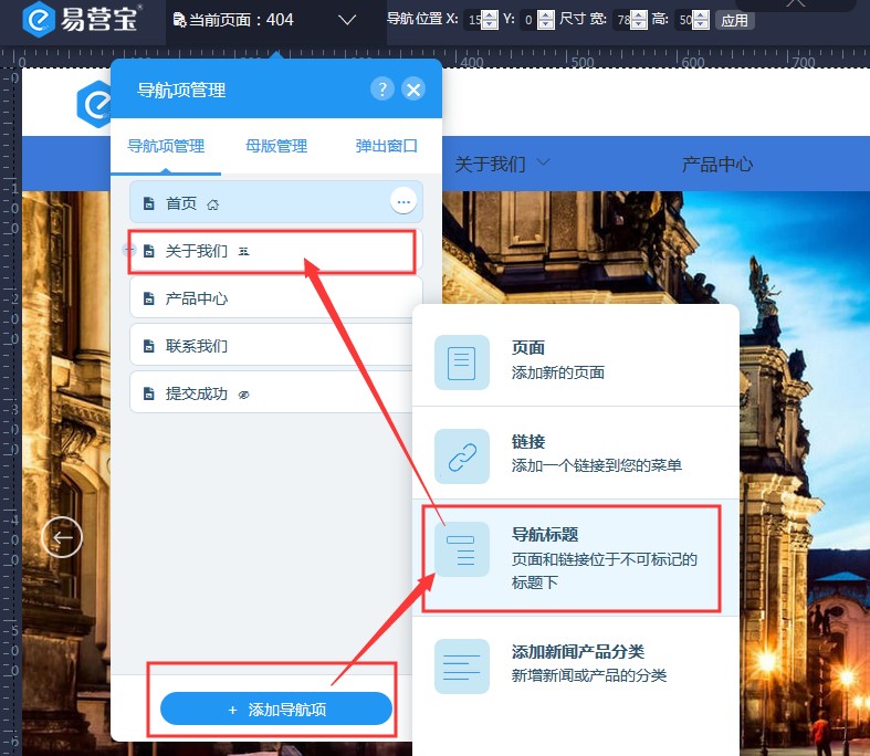 1,添加一级导航时,选择“导航标题”,这样,一级导航就只是一个标题,没有对应的页面。
