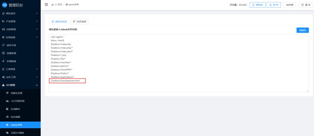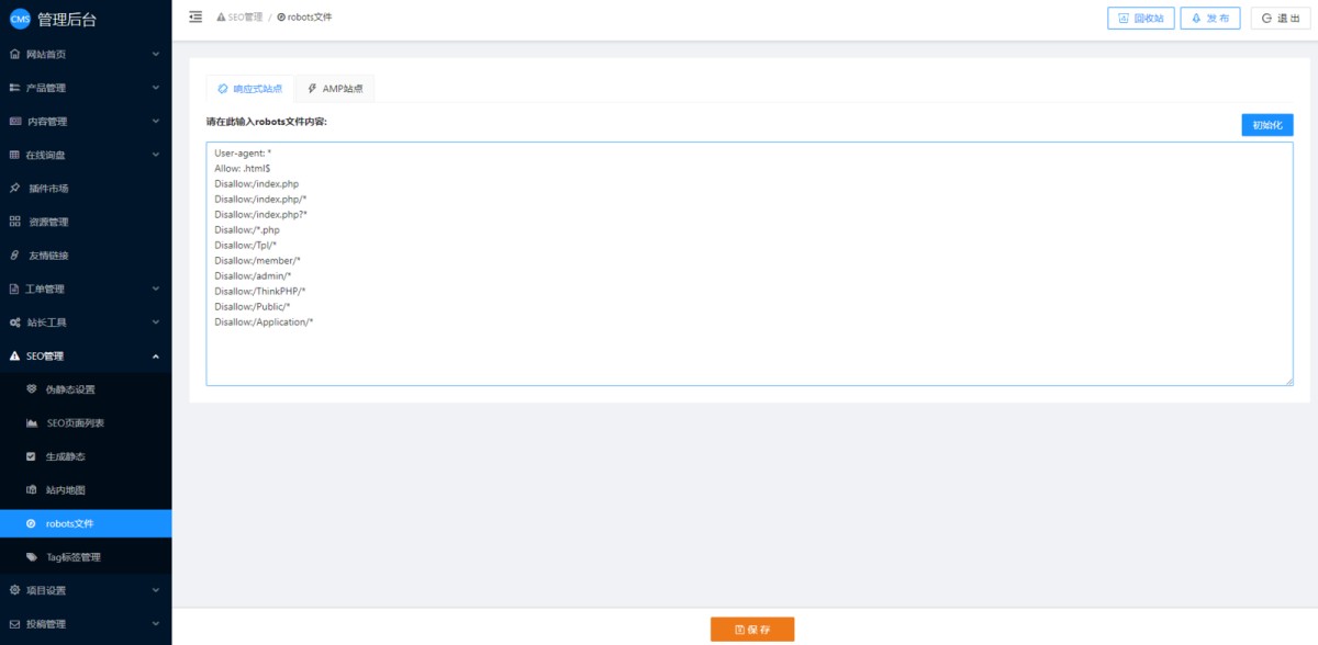 如果需要自定义robots文件,可以在CMS管理后台-SEO管理-robots文件里修改。如果自定义后,还想再改回系统默认的robots文件,可以点击右边的初始化按钮,即可恢复系统默认的robots文件内容。修改后保存发布即可。