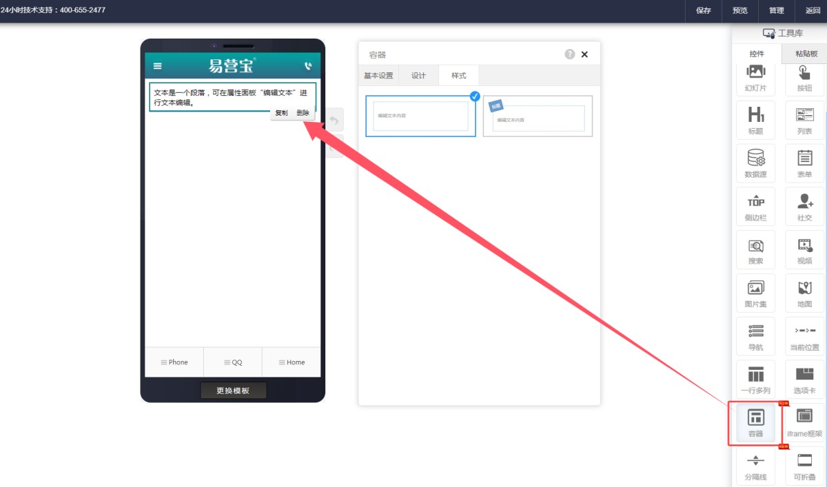 1,在页面编辑里拖入容器控件,界面会容器的样式,目前样式有两种选择。