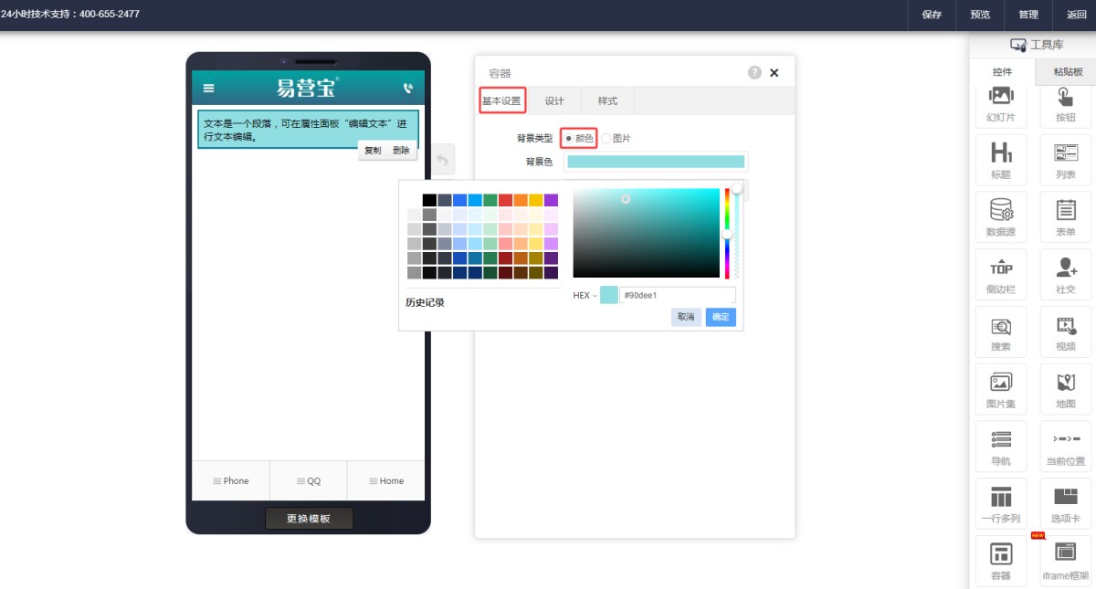 2,属性切换到基本设置,可以设置容器的背景,背景类型分为颜色和图片。类型选择“颜色”时,可以设置背景色。