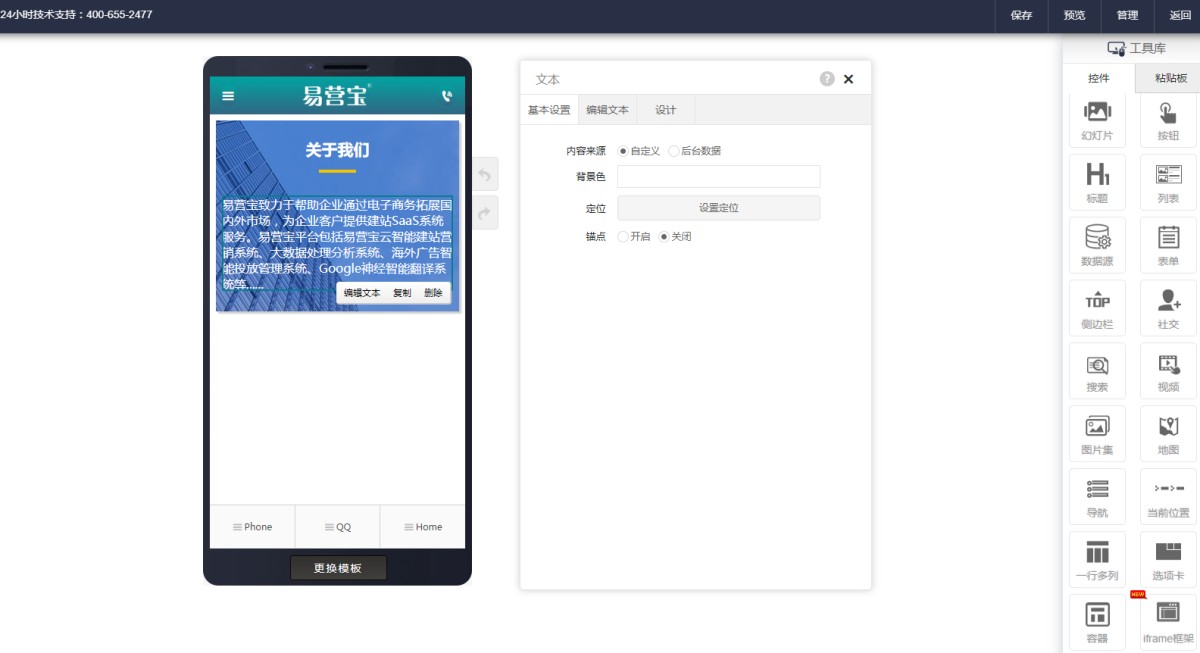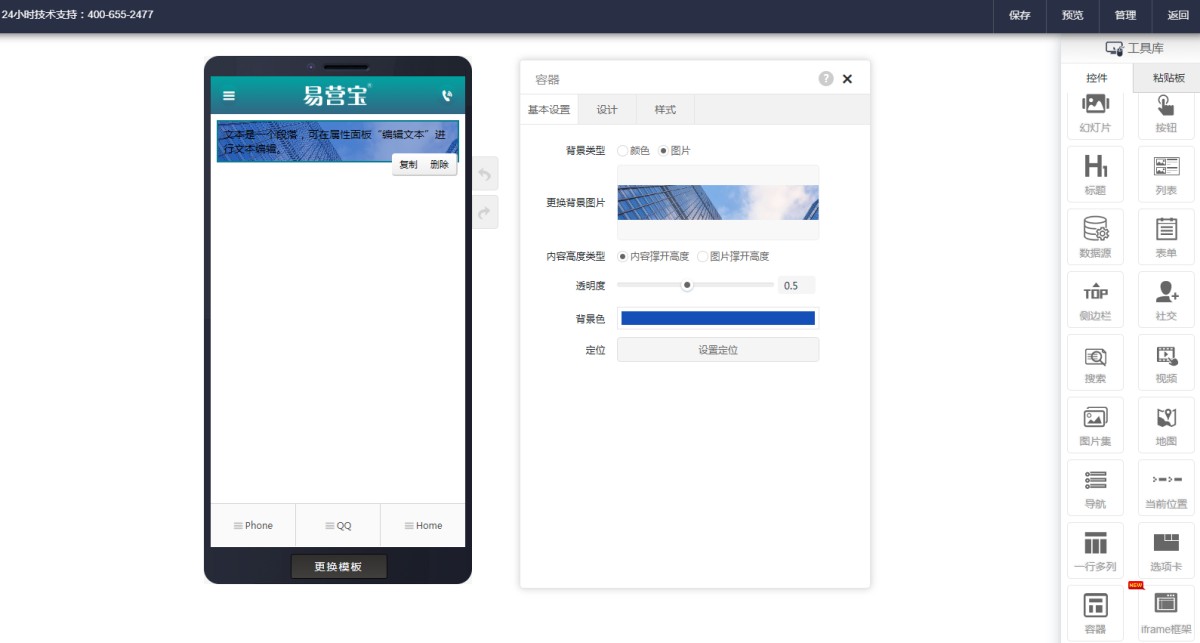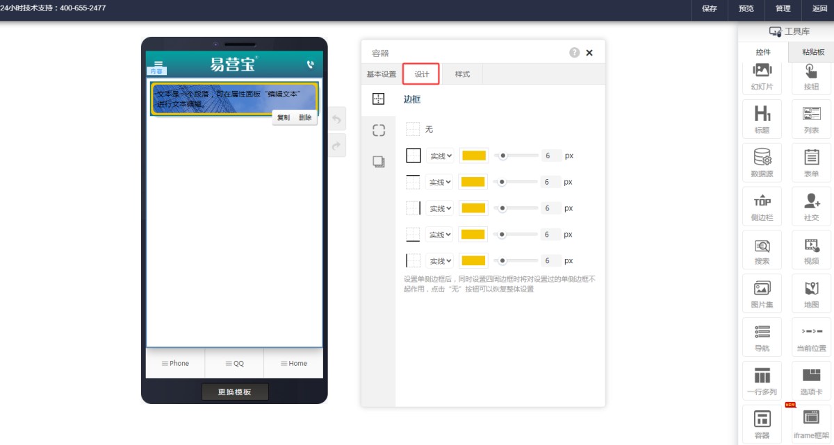 6,容器样式设置完成后,就可以往容器里添加控件了,如文本,按钮,图片等,每个控件都可以单独调整样式。