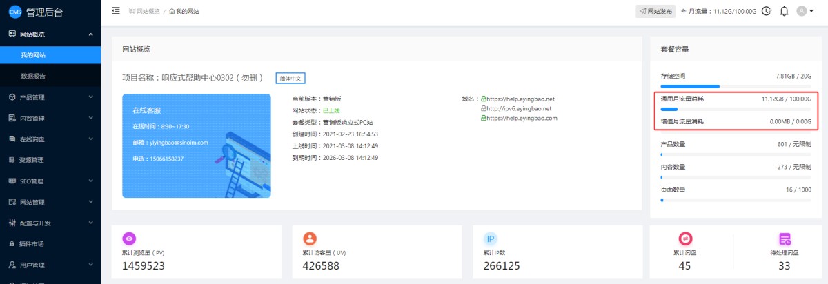 1,在CMS后台网站概览里,右侧会显示套餐容量。