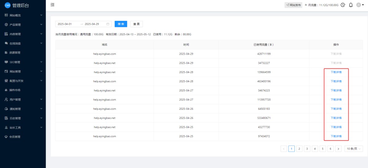 每月流量的使用情况,可以在CMS管理宏图查看。