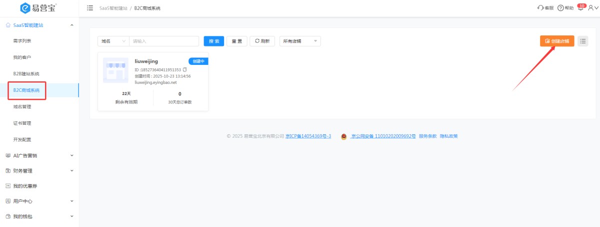 1,登录易营宝系统,在左侧菜单栏选择B2C商城系统,点击创建店铺。