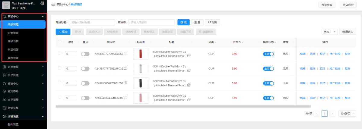 4,在左侧菜单栏的商品中心,添加需要售卖的商品。