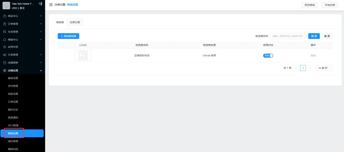 6,在店铺设置-物流设置里,设置物流商和运费,