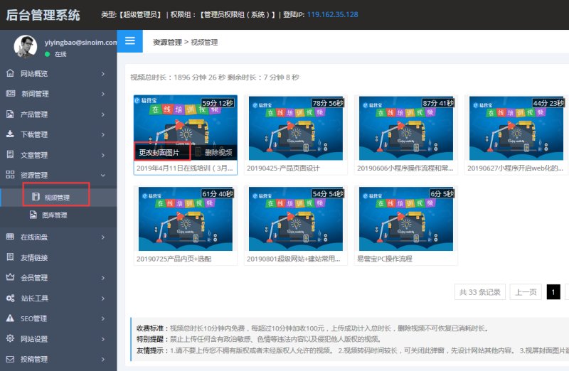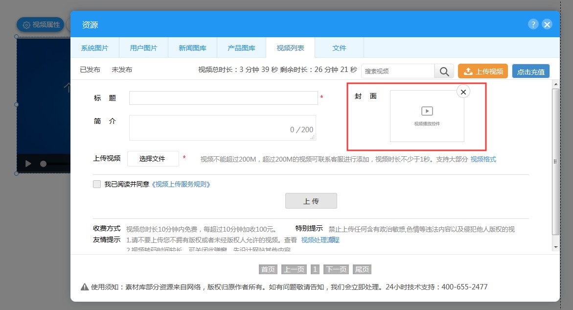 3,视频上传成功后,在管理后台-资源管理-视频管理里,也可以修改视频的封面,但是这里修改完封面后,视频控件需要重新选一下视频才能生效。