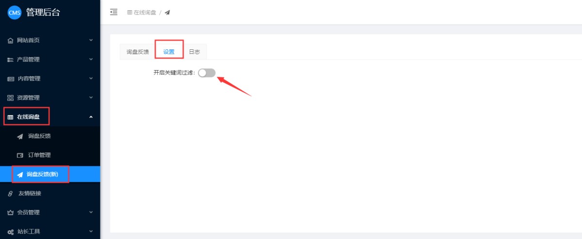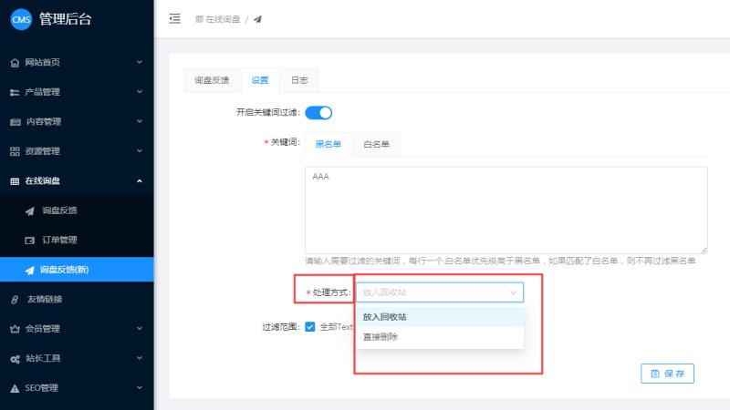 1,在网站管理后台-表单反馈(新)-设置里,开启关键词过滤。