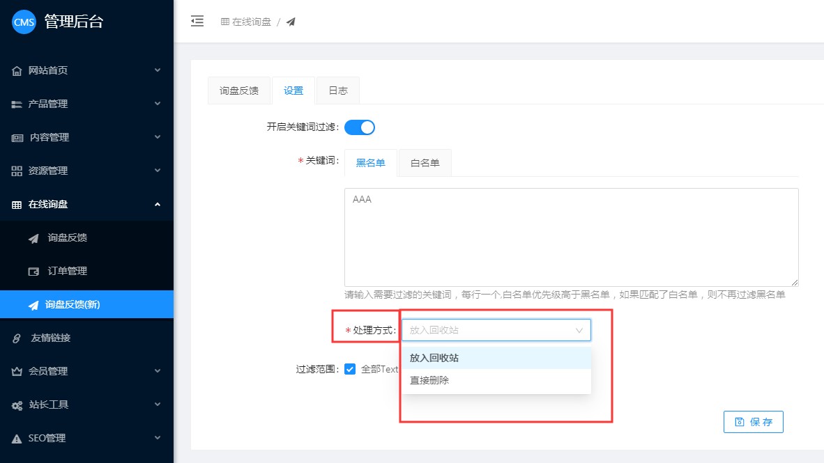 3,设置黑名单后,在“处理方法”这里,可以选择垃圾询盘是放入回收站,还是直接删除。