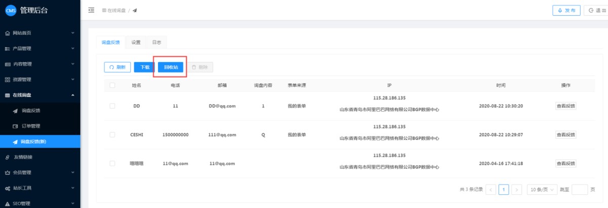 4,在询盘反馈里,有个“回收站”按钮,点击可以进入回收站。