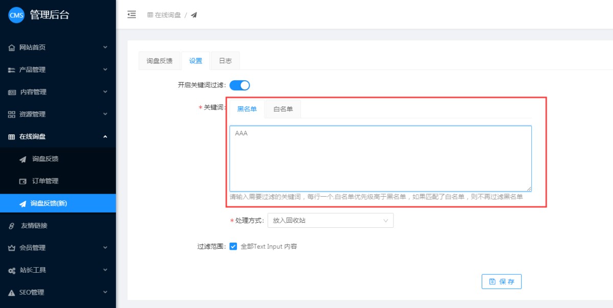 2,开启关键词过滤后,可以设置黑名单和白名单。黑明单是过滤关键词的,即客户提交的询盘里包含这个词时,系统就会判定为垃圾询盘;白名单是指可信任的关键词,即客户的询盘里包含这个词后,系统就判定为正常询盘。白名单的优先级高于黑名单,即当客户询盘里即包含了黑名单的关键词,也包含了白名单的关键词时,会按照白名单判定为正常询盘。设置关键词时,一行设置一个关键词。