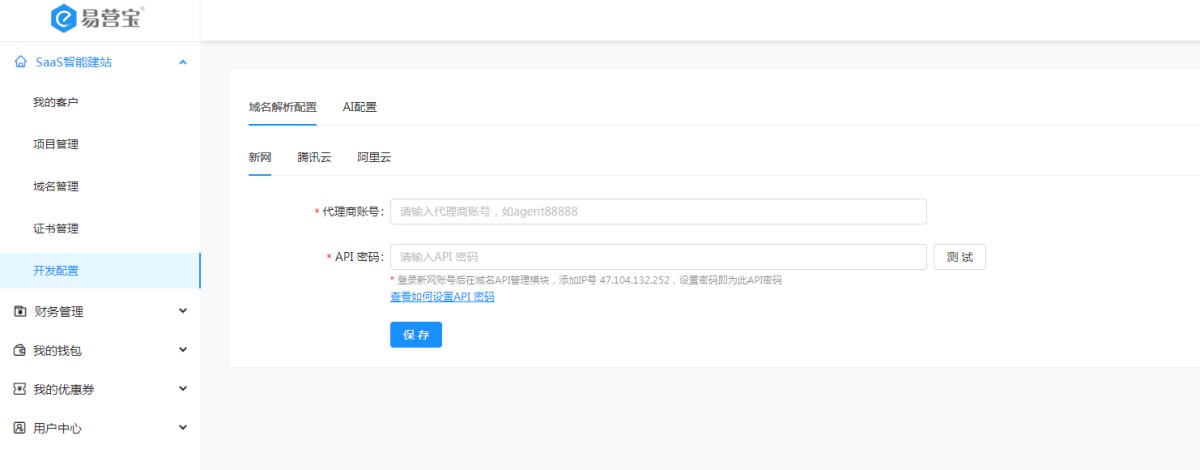 1,登录代理商建站账号,在SaaS智能建站-开发配置-域名解析配置i,选择新网,这里需要填写代理商账号和API密码,即可配置完成。代理商账号即新网的账号(账号级别需为新网代理商)。