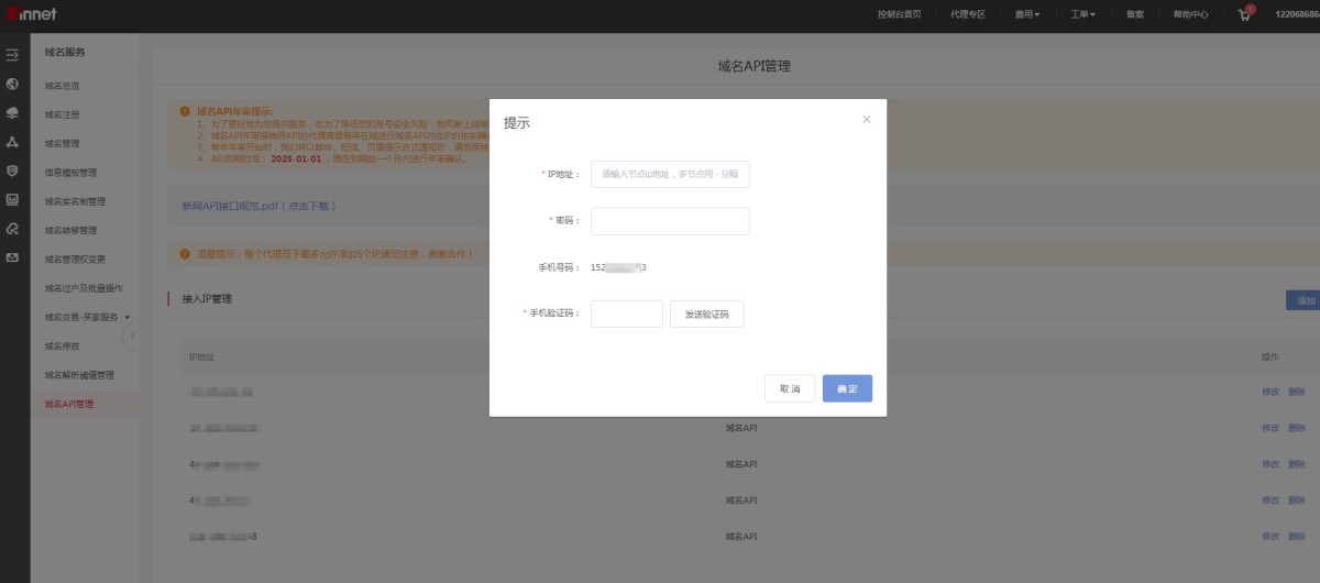 2,获取API密码:登录新网账户,在“域名API管理”里点击“添加”。