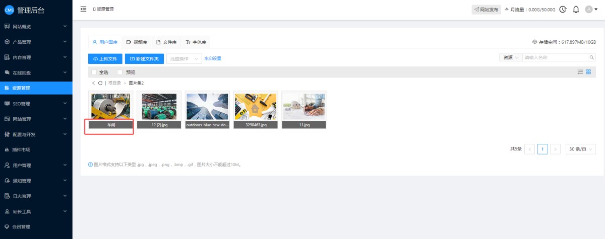 4,图片集:如果图片集是调用后台用户图库里的文件夹(图一),则图片Alt是引用的资源库里的图片名称。可以在后台资源库-图库里修改文件名称(图二)。