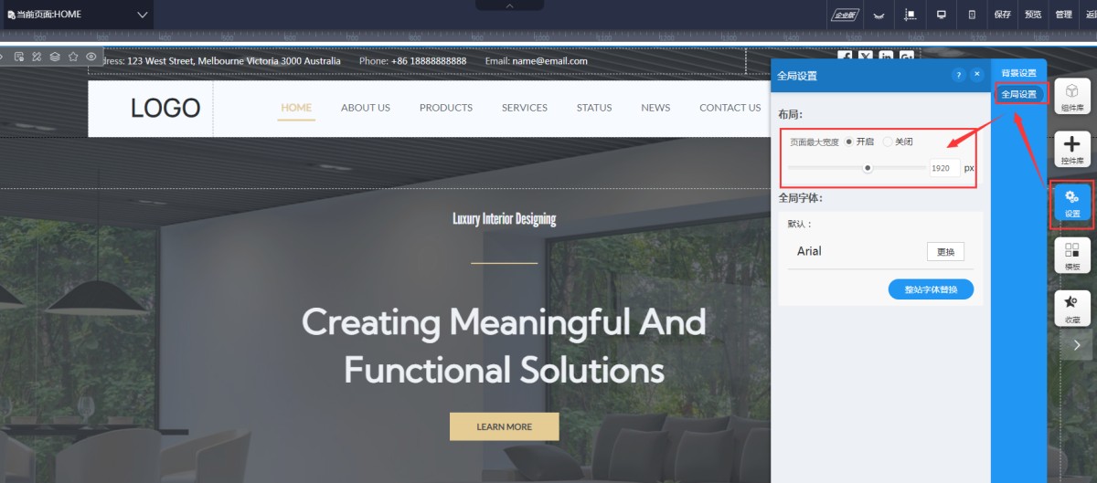 在网站UI编辑页面,点击设置-全局设置,在布局处,开启页面最大宽度,根据需求设置最大宽度的值即可。
