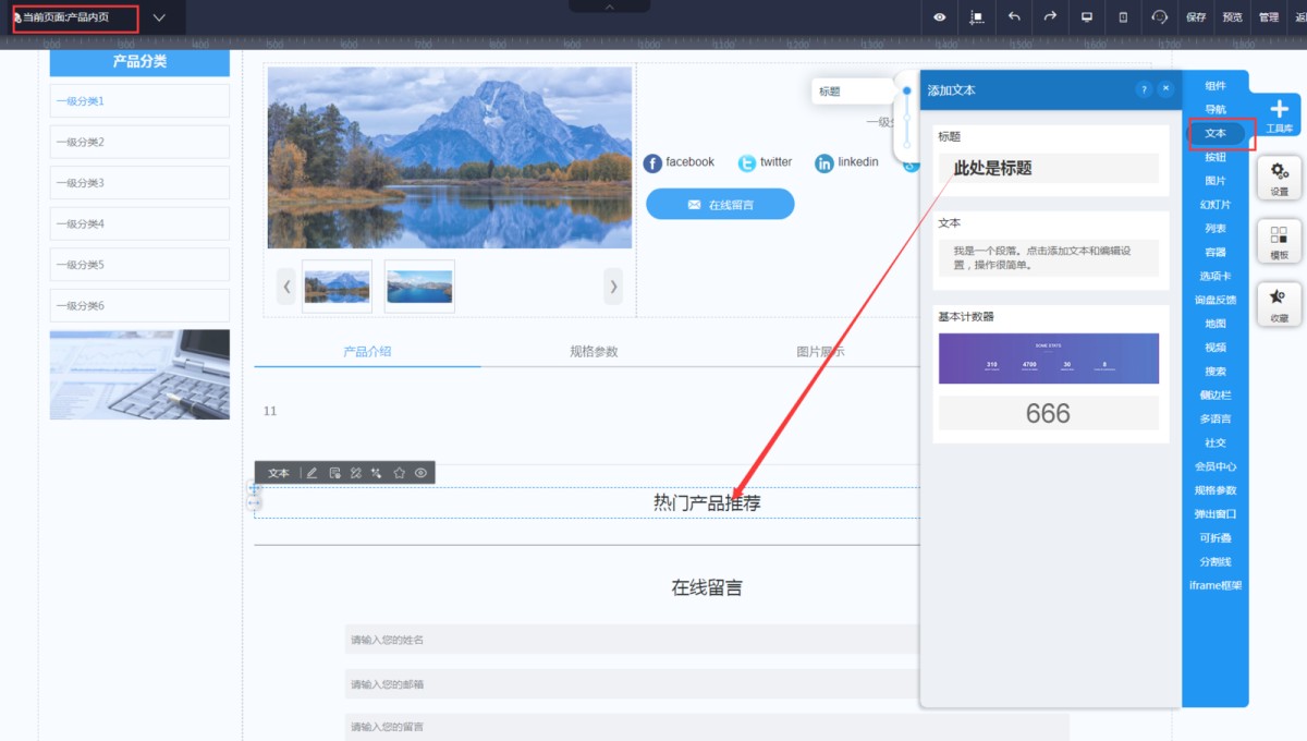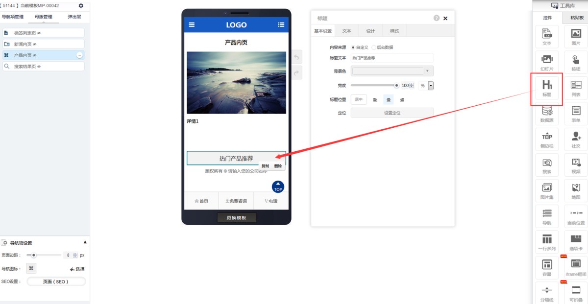 1,在编辑页面-母版管理-产品内页里,添加一个标题控件,文本改成“产品推荐”,标题的样式可在属性里修改。